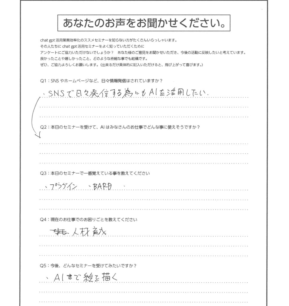Q2:本日のセミナーを受けて、AIはみなさんのお仕事でどんな事に使えそうですか?