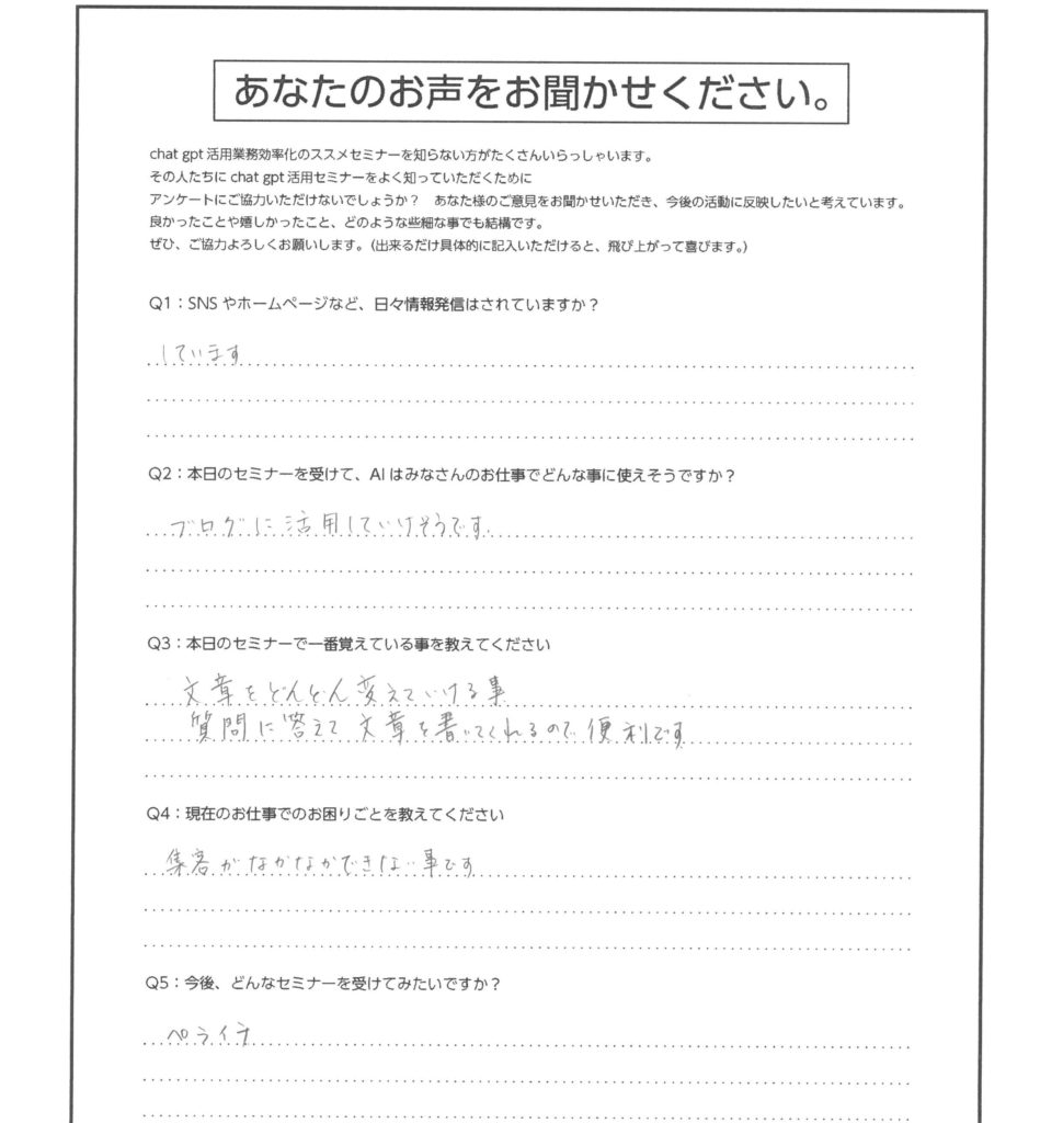Q2:本日のセミナーを受けて、AIはみなさんのお仕事でどんな事に使えそうですか?