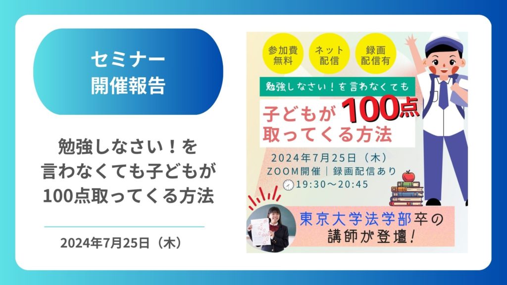 2024年7月25日(木)、コーチング塾マイクランド代表山本倫孝さんをお迎えし、勉強しなさい!を言わなくても子どもが100点取ってくる方法セミナーを開催しました。