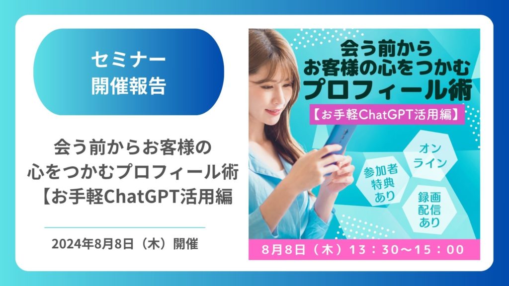 2024年8月8日(木)、勝たせる言語化サポーターのただゆりさんをお迎えし、会う前からお客様の心をつかむプロフィール術【お手軽ChatGPT活用編】を開催しました。