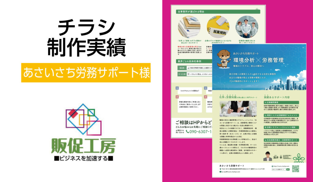 こんにちは!今日は、私たち「販促工房」が制作した実績の一つ、「あさいさち労務サポート様」の営業用チラシをご紹介します。この記事を読んでいただくと、営業に役立つチラシがどのように作られているのか、そのコツを知ることができます。