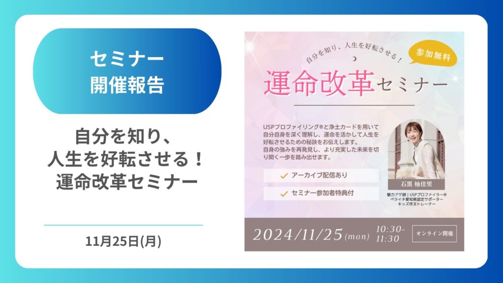 2024年11月25日、石黒柚佳里をお迎えし、自分を知り、人生を好転させる!運命改革セミナーを開催しました。