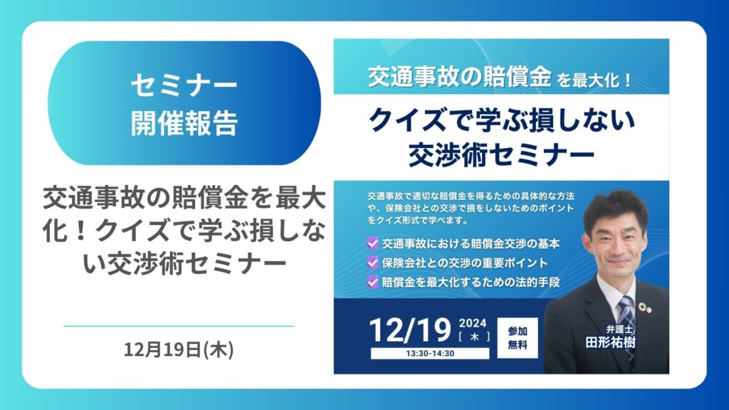 2024年12月19日、田形 祐樹先生をお迎えし、交通事故の賠償金を最大化!クイズで学ぶ損しない交渉術セミナーを開催しました。