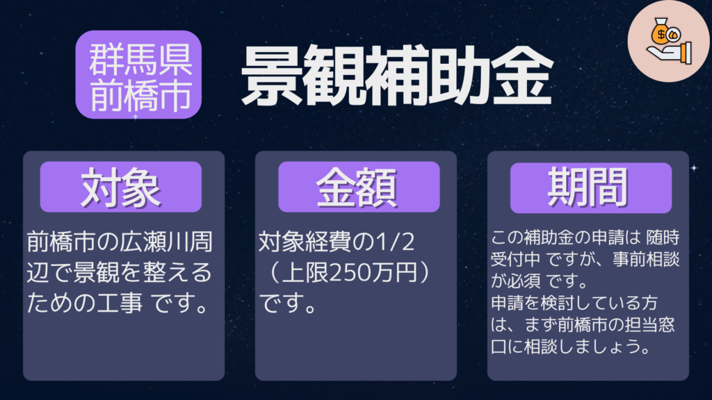 この補助金は、前橋市が 広瀬川周辺の景観をより美しくするため に行っている支援制度です。