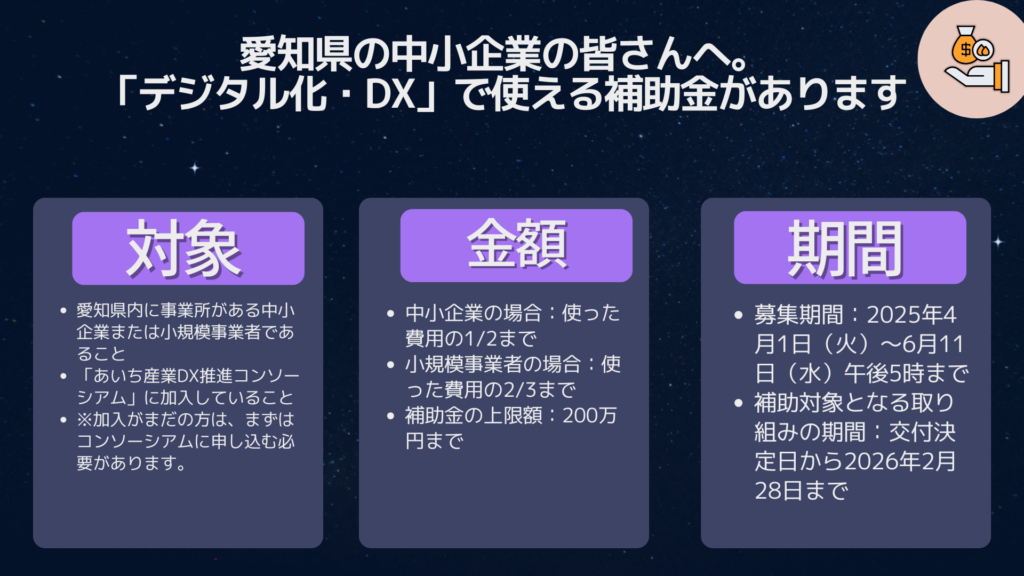 愛知県では、2025年4月1日から「中小企業デジタル化・DX支援補助金」の受付が始まりました。