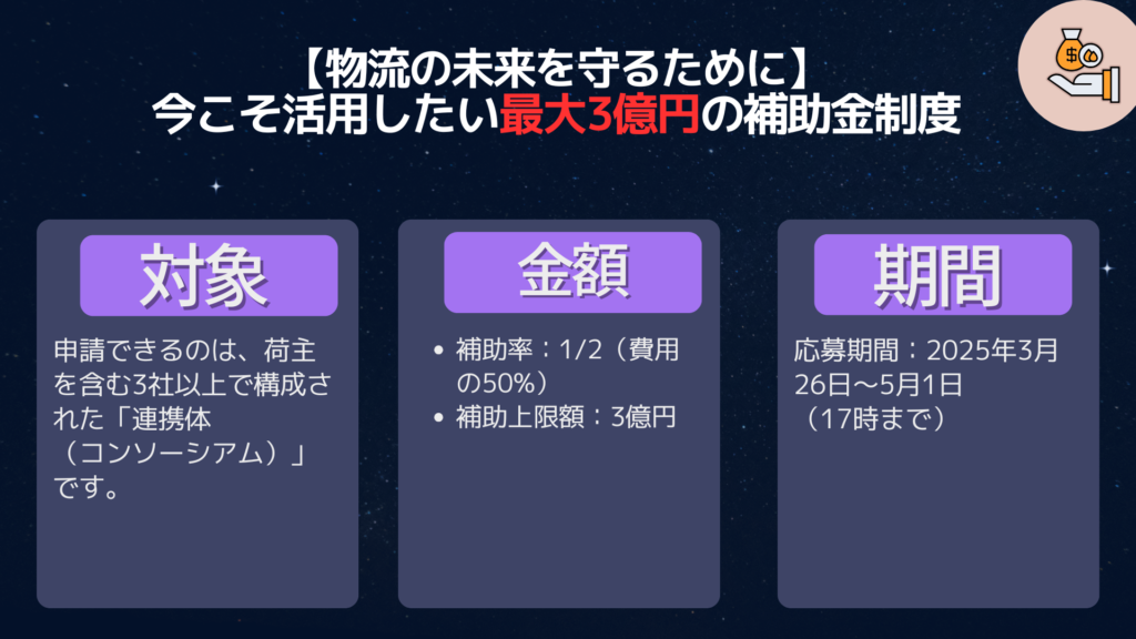 この補助金の最大の魅力は、物流の効率化に取り組む企業グループ(連携体)に対し、最大で3億円まで費用の半分を補助してくれるという点です。特に荷主を含む3社以上の企業がチームとなり、物流施設の自動化や機械化、デジタルシステム導入などに取り組むことで申請の対象となります。