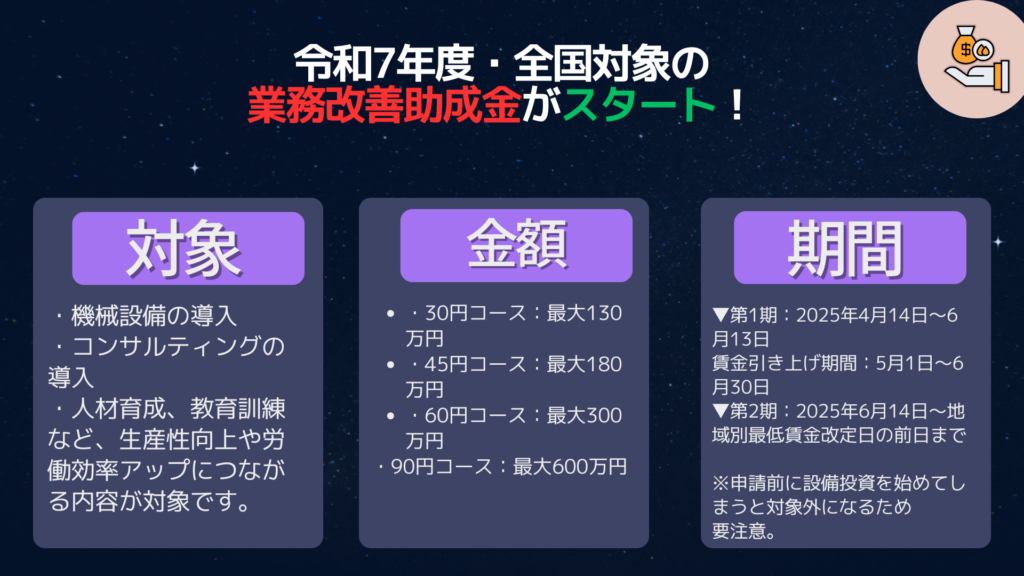 など、生産性向上や労働効率アップにつながる内容が対象です。