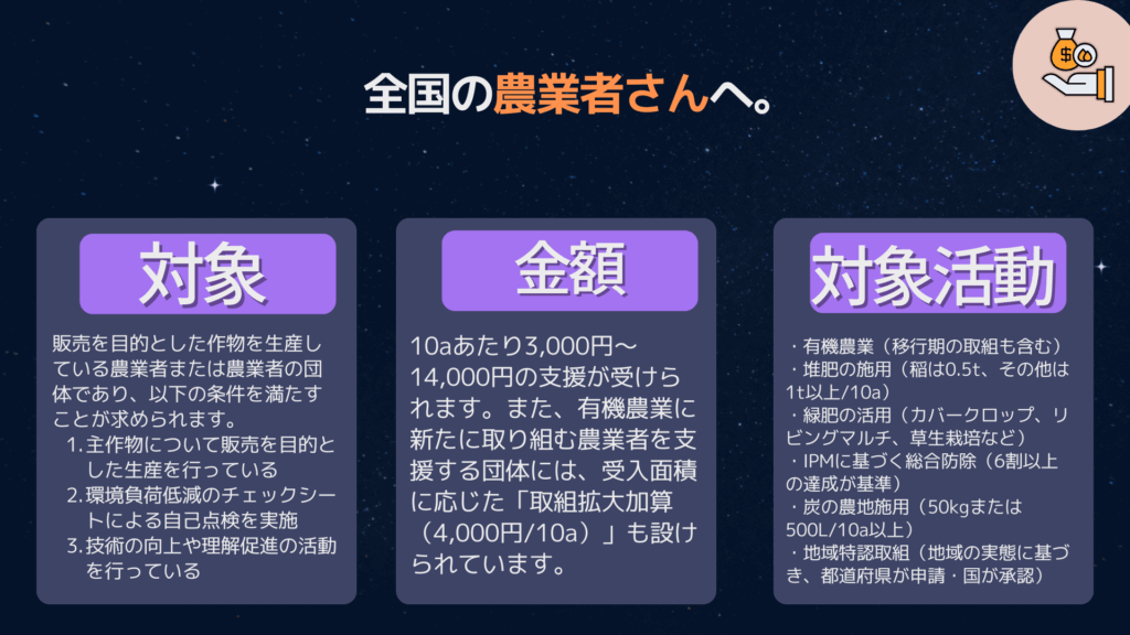 これらの活動には、10aあたり3,000円〜14,000円の支援が受けられます。また、有機農業に新たに取り組む農業者を支援する団体には、受入面積に応じた「取組拡大加算(4,000円/10a)」も設けられています。