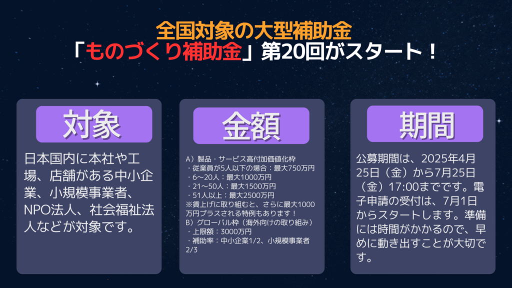 公募期間は、2025年4月25日(金)から7月25日(金)17:00までです。電子申請の受付は、7月1日からスタートします。準備には時間がかかるので、早めに動き出すことが大切です。