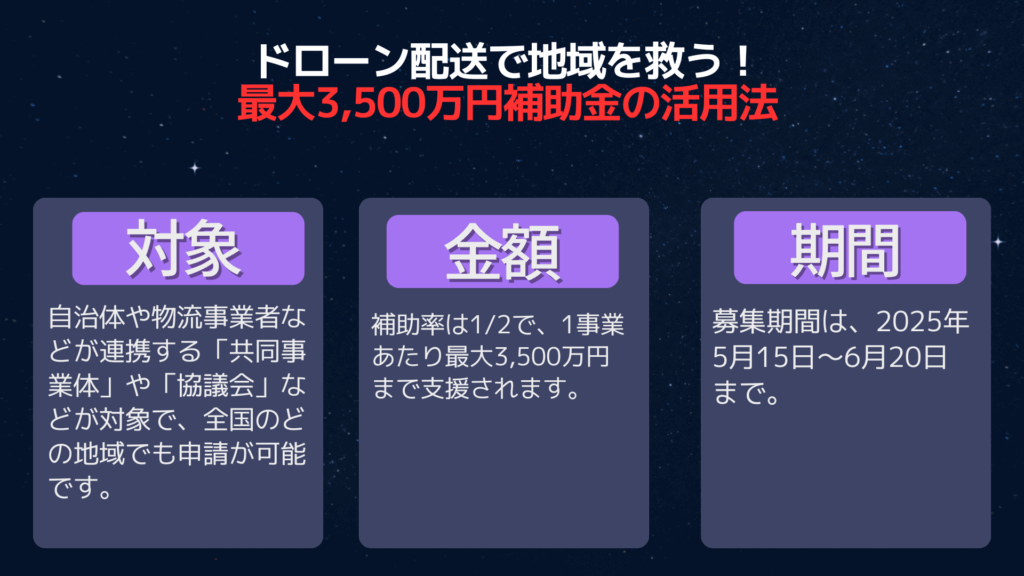 特に注目したいのは、「調査段階」から補助の対象となる点。つまり、「ドローン配送を始めたいけど、まずは地域のニーズを調べたい」という段階でも支援を受けられるのです。