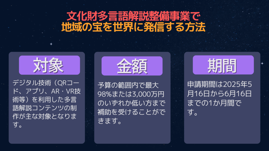 文化財多言語解説整備事業は、地域の文化資源を活用して観光振興と文化継承を同時に実現できる優れた制度です。適切な準備と戦略的な申請により、最大98%の補助を受けながら、地域の宝である文化財を世界に発信することができます。申請期間が限られているため、興味のある事業者は早急に検討を始めることをお勧めします。
