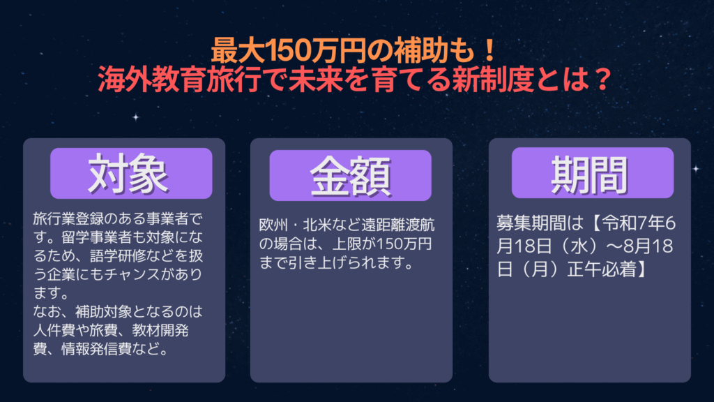 対象となるのは、旅行業登録のある事業者です。留学事業者も対象になるため、語学研修などを扱う企業にもチャンスがあります。