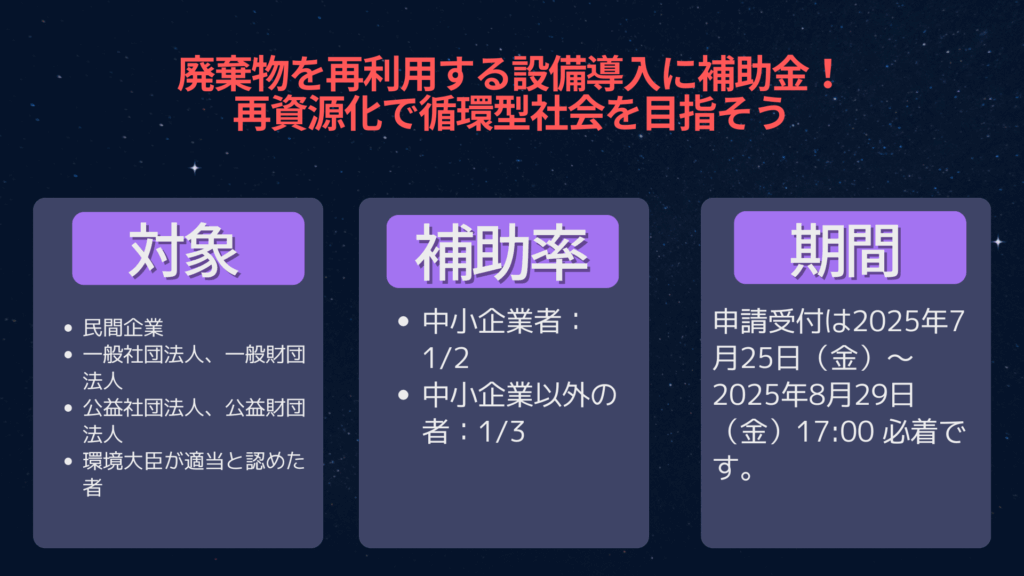 環境省は2025年7月25日から、「令和6年度補正予算 地産地消型資源循環加速化事業(第3次公募)」の申請受付を開始しました。この事業では、これまで再資源化が難しかった廃棄物を、地域内で資源として再生・活用する取り組みに対して、設備導入費用などの一部が補助されます。