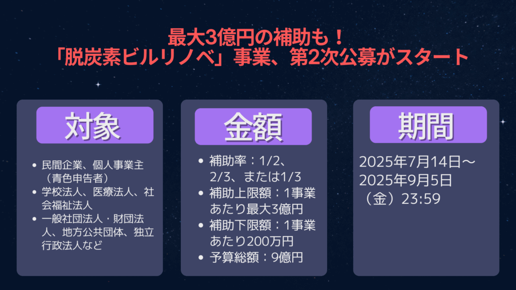2025年7月14日から、環境共創イニシアチブ(SII)が実施する「脱炭素ビルリノベ(先進モデル導入)」事業の第2次公募が始まりました。応募締切は2025年9月5日(金)23:59までです。