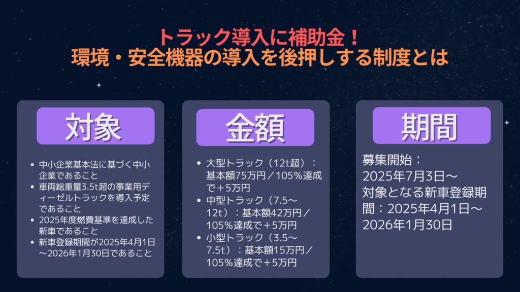 この条件を満たす企業が、新たにトラックや安全機器を導入する際、申請により補助を受けることができます。