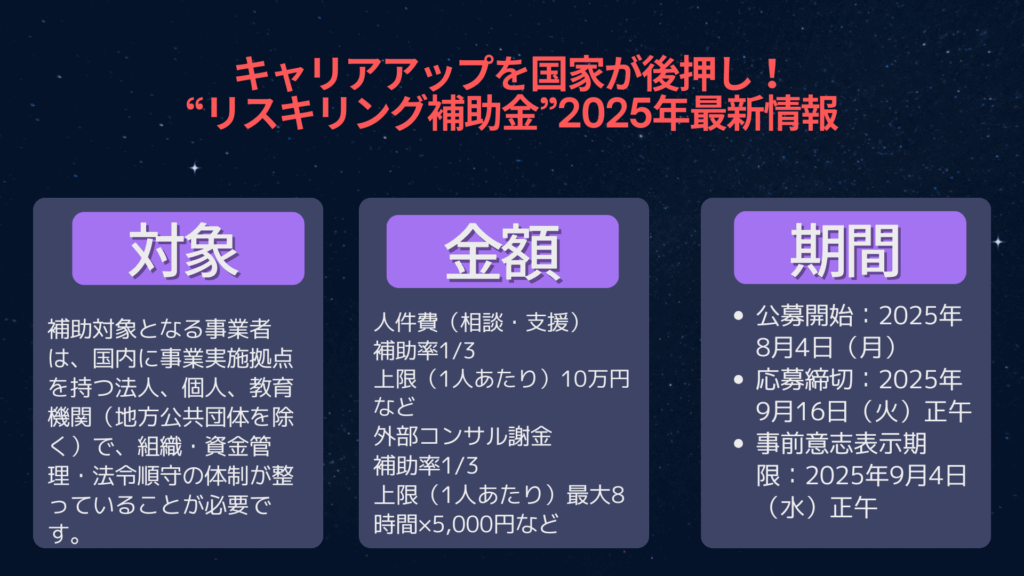 2025年8月4日、経済産業省は在職者向けの転職前提リスキリング支援補助金を開始しました。この制度はキャリア相談、専門講座提供、転職支援、フォローアップを一体化で提供できる民間事業者を対象に、経費の一部を補助するものです。特に「産業間の人材移動」や「リスキリングによる賃金上昇」の成果が重視されています。