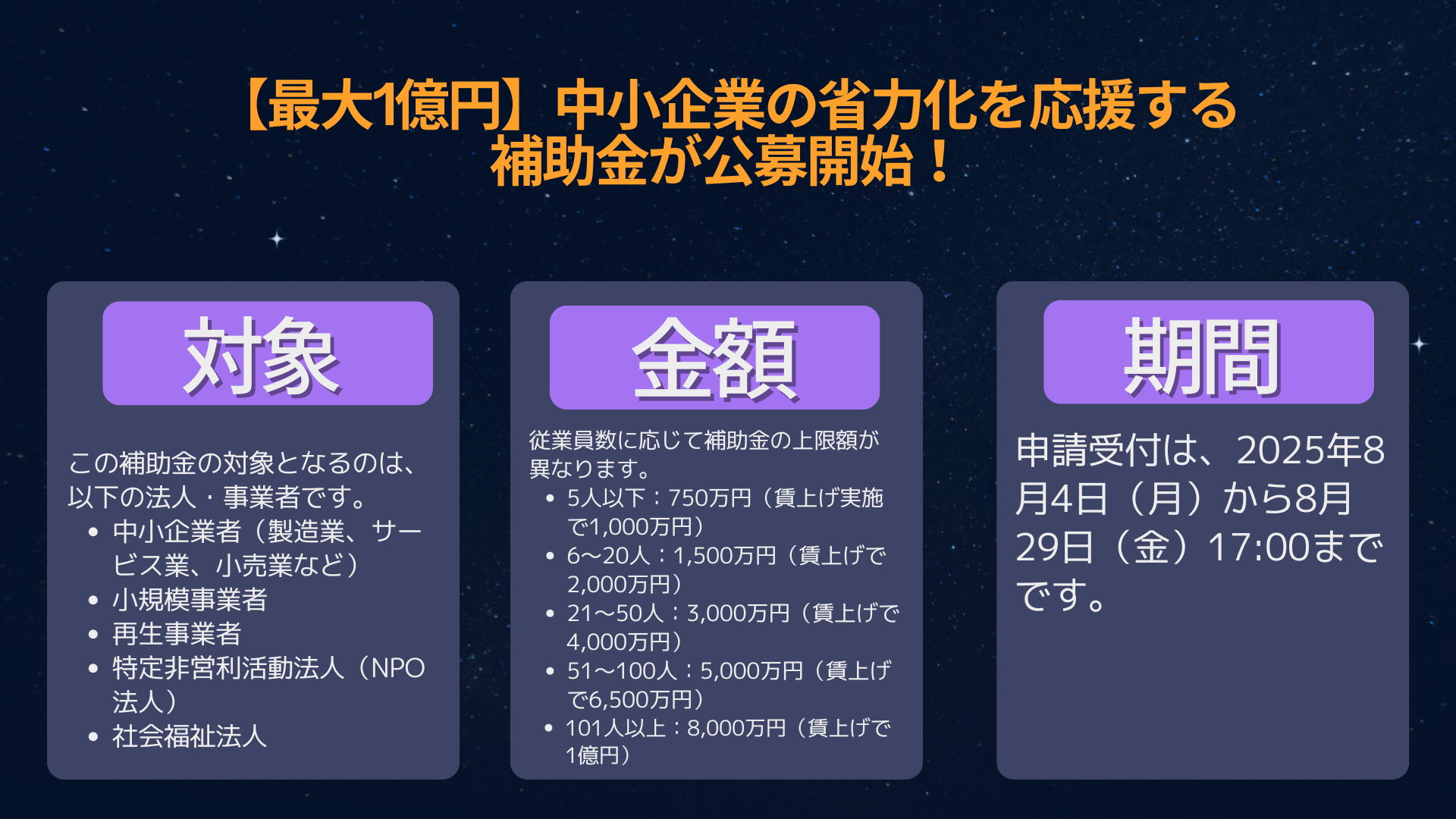 申請受付は、2025年8月4日(月)から8月29日(金)17:00までです。