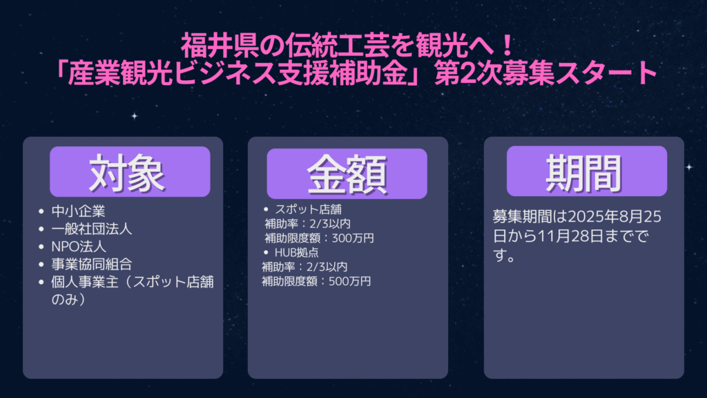 福井県では、地域に根付く伝統工芸を観光資源として発展させるために、「産業観光ビジネス支援事業補助金」の第2次募集が始まりました。募集期間は2025年8月25日から11月28日までです。この記事では、補助金の概要、対象となる事業者、補助内容について詳しく解説します。