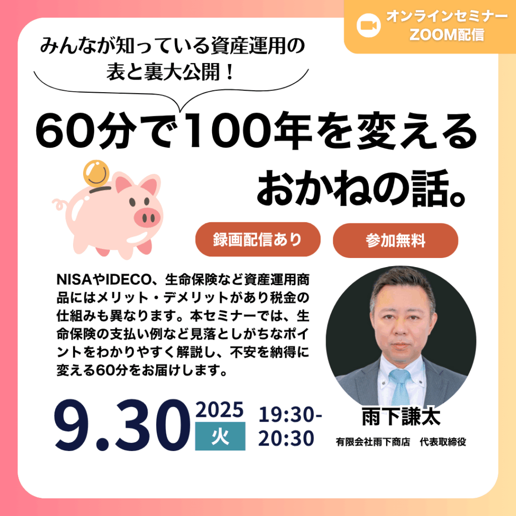 NISAやiDeCo、生命保険など、今や多くの資産運用商品があふれていますが、それぞれにメリット・デメリットがあり、税金のかかるポイントも違います。本セミナーでは、プロの視点から「本当に知っておきたいお金の話」をわかりやすく解説。特に、生命保険の“支払われるケース・支払われないケース”など、見落とされがちな部分を重点的にお伝えします。「なんとなく不安」を「納得」に変える60分。未来のお金の選び方がきっと変わります。