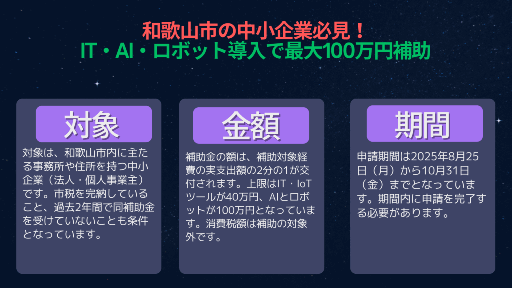 詳細は和歌山市の公式サイトで確認し、自社に合った導入計画を立てましょう。