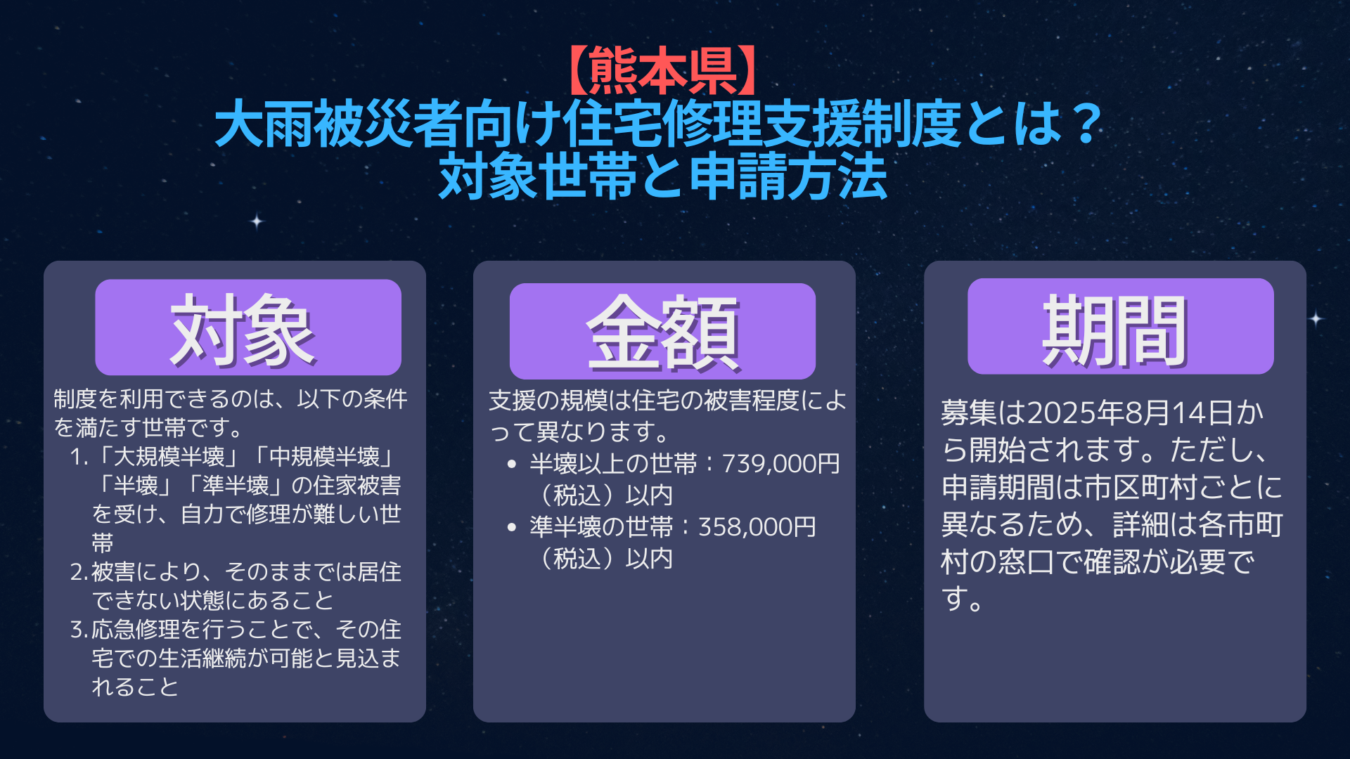 熊本県「令和7年8月大雨」住宅応急修理支援の概要と対象条件 令和7年8月10日からの大雨により、熊本県内の多くの地域で住宅が被害を受けています。被災された方々の生活再建を支援するため、熊本県と市町村では「住宅の応急修理支...