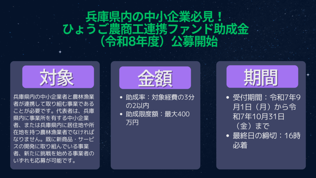 「ひょうご農商工連携ファンド事業助成金」は、兵庫県の中小企業と農林漁業者が協力して新しい挑戦をする絶好の機会です。地域資源を活かしたビジネスに関心のある方は、ぜひ応募を検討してください。