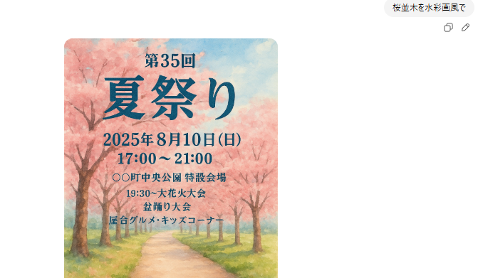 ChatGPTに「夏祭りのポスターを作りたい」とお願いすると、デザイン案を出してくれます。