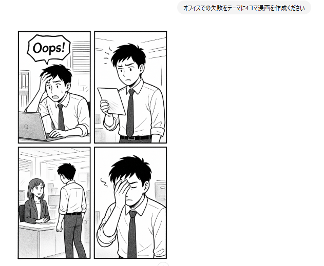 • 4コマ漫画:「オフィスでの失敗をテーマに」と依頼すれば、SNSで映える漫画が完成。