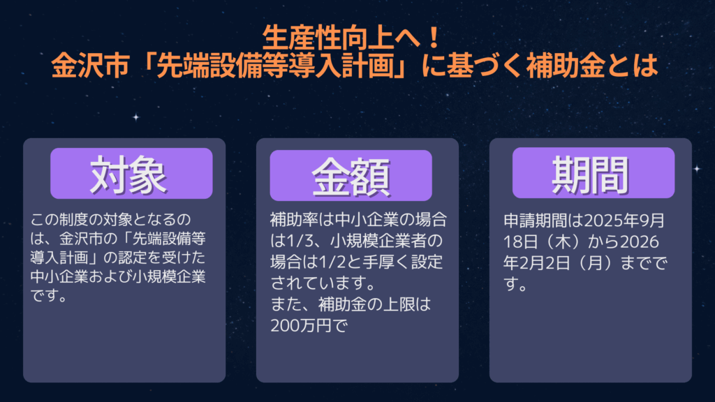 この補助金は、物価高騰の影響を受けている市内中小企業の経営基盤を強化し、さらに生産性を高めることを目的としています。補助対象となるのは「金沢市の認定を受けた先端設備等導入計画」に記載された設備の導入費です。つまり、計画に基づいた成長投資をしっかりサポートする仕組みです。