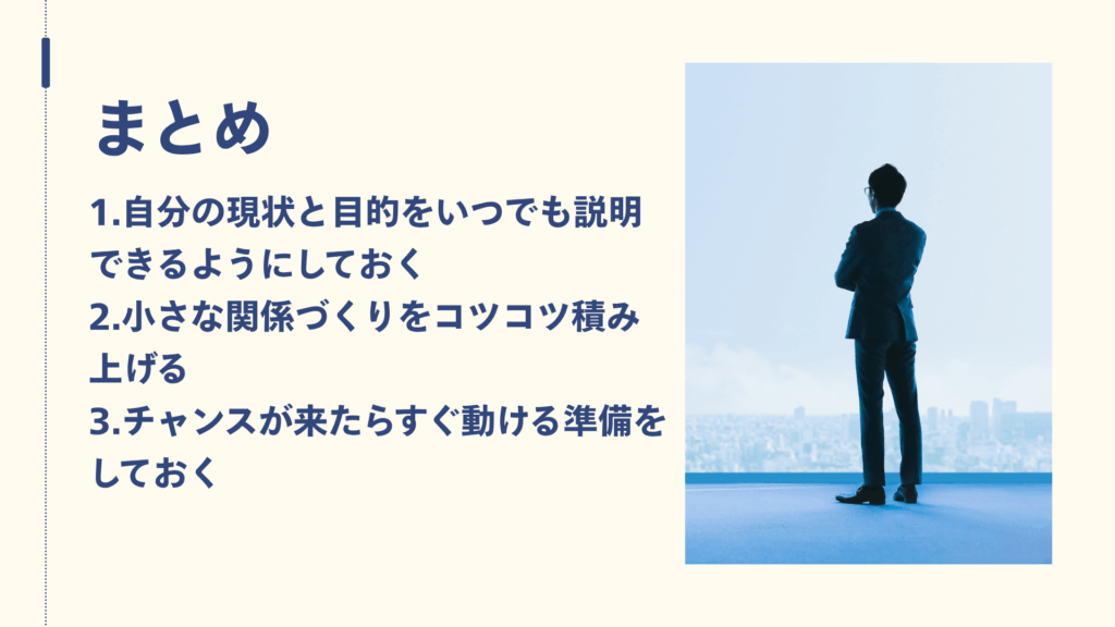 つまり、自分の現状と目的を簡潔に説明できることが、出会いをチャンスに変える第一歩です。