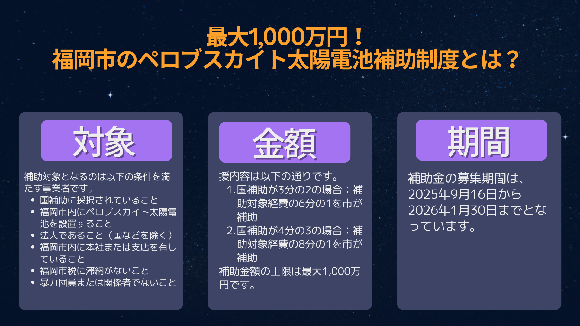 補助金・助成金情報福岡市が次世代「ペロブスカイト太陽電池」の導入を支援 福岡市では、市内における再生可能エネルギーの普及をさらに推進するため、次世代の太陽電池として注目を集める「ペロブスカイト太陽電池」の導入を支援する制度を開始しました。...