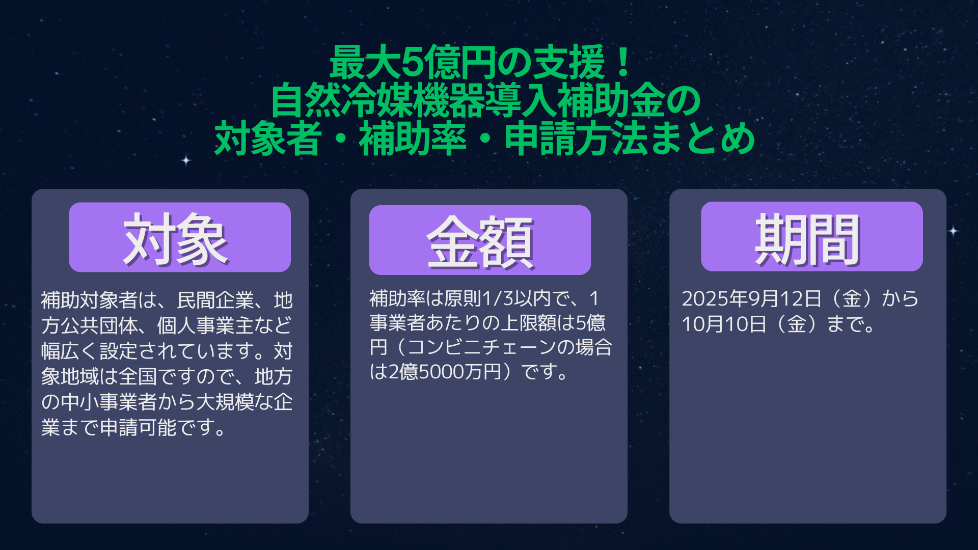 補助金・助成金情報脱炭素型自然冷媒機器導入補助金とは?2025年度第2次公募の詳細 環境省は、冷凍冷蔵倉庫や食品製造工場、食品小売店舗において使用される冷凍・冷蔵設備の脱炭素化を進めるため、「脱炭素型自然冷媒機器導入補助金」の第2次公募を...