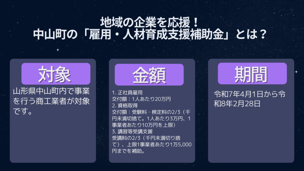 山形県中山町内で事業を行う商工業者が対象です。地域企業の発展を支援するために設けられた制度であり、地域経済の活性化を目的としています。
