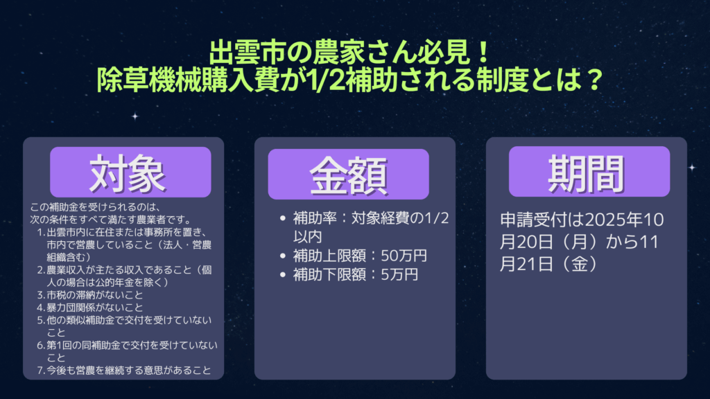 この機会を逃さず、出雲市の支援を活用して、より持続的で効率的な農業経営を目指しましょう。