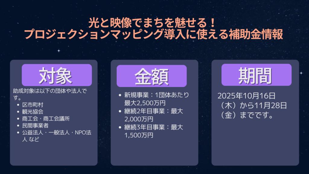 「プロジェクションマッピング促進支援事業」は、夜間観光を強化したい自治体や観光団体、企業にとって大きな支援策です。