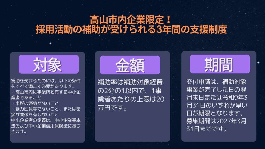 採用活動には、求人広告費や説明会出展費など多くのコストがかかります。この補助金を活用すれば、採用コストを抑えながらより良い人材を確保できるチャンスです。高山市内の中小企業の皆さまは、ぜひ早めに制度の内容を確認し、積極的に活用してください。