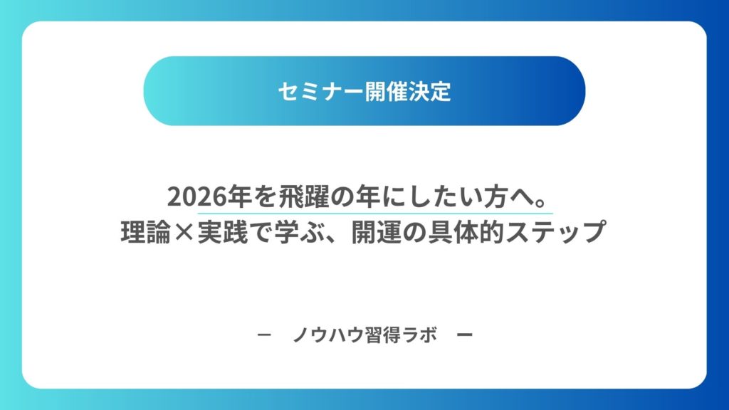 2026年を「飛躍の年」にしたい方へ。 このセミナーでは、四柱推命の知恵を使って“自分に合った目標設定”と“運を味方につける行動法”を学びます。プロ鑑定士がわかりやすく解説し、理論だけでなく実際に活かせる具体的なヒントをお伝えします。さらに、参加者の中から抽選で2名様に公開鑑定を実施。自分の運勢を深く知るチャンスです。学びながら自分を見つめ直し、行動の指針を手に入れる75分。2026年を笑顔で迎えたい方、自分らしい一歩を踏み出したい方にぴったりの新春開運セミナーです。