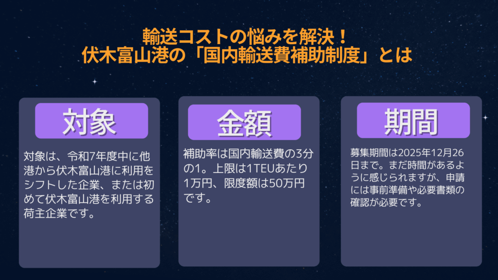 この制度は、伏木富山港の利用促進と県内物流の効率化を目的としており、特に国内輸送のコスト削減を目指す企業にとって大きなチャンスです。