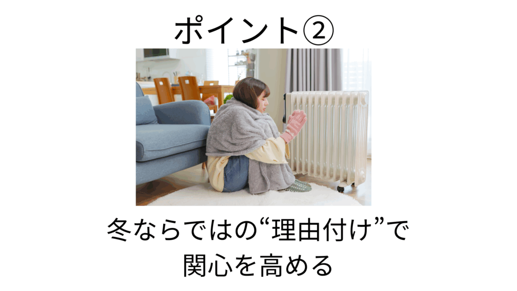 お客様は「冬だから必要だよね」と納得しやすく、行動に移す可能性が高まります。