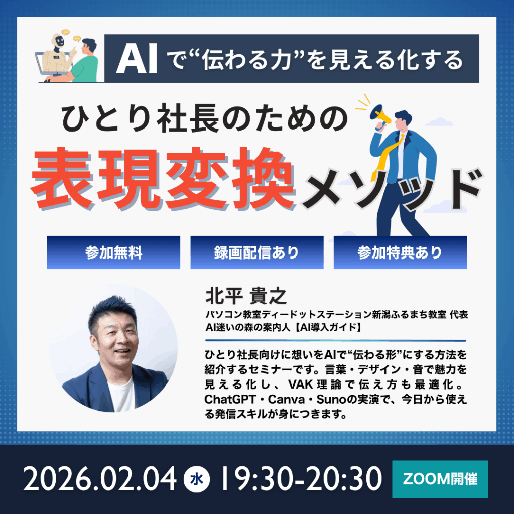 AIで“伝わる力”を見える化する ひとり社長のための表現変換メソッドは、発信や営業が苦手なひとり社長・個人事業主のためのセミナーです。あなたの中にある想い・価値観・世界観を、AIを使って“伝わる形”に変える方法をやさしく解説します。AIは感性の翻訳機。言葉・デザイン・音として見える化することで、あなたの魅力はもっと届きます。VAK理論を取り入れ、相手が受け取りやすい伝え方のコツも紹介。さらに、ChatGPT・Canva・Sunoを使った実演で、今日から使える表現変換メソッドを体感できます。発信の負担を減らし、共感で選ばれる仕組みづくりをサポートします。
