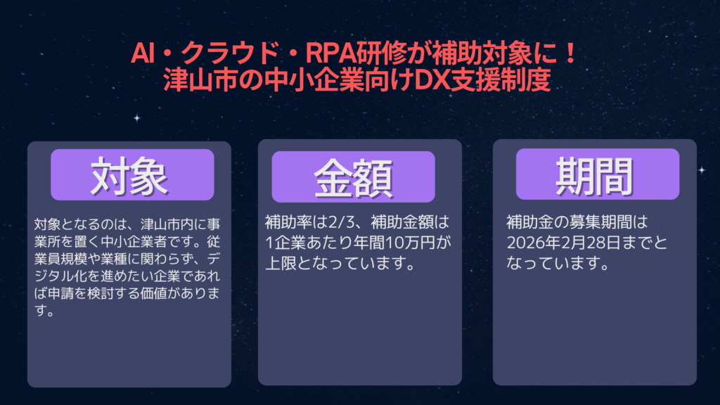 対象となるのは、津山市内に事業所を置く中小企業者です。従業員規模や業種に関わらず、デジタル化を進めたい企業であれば申請を検討する価値があります。