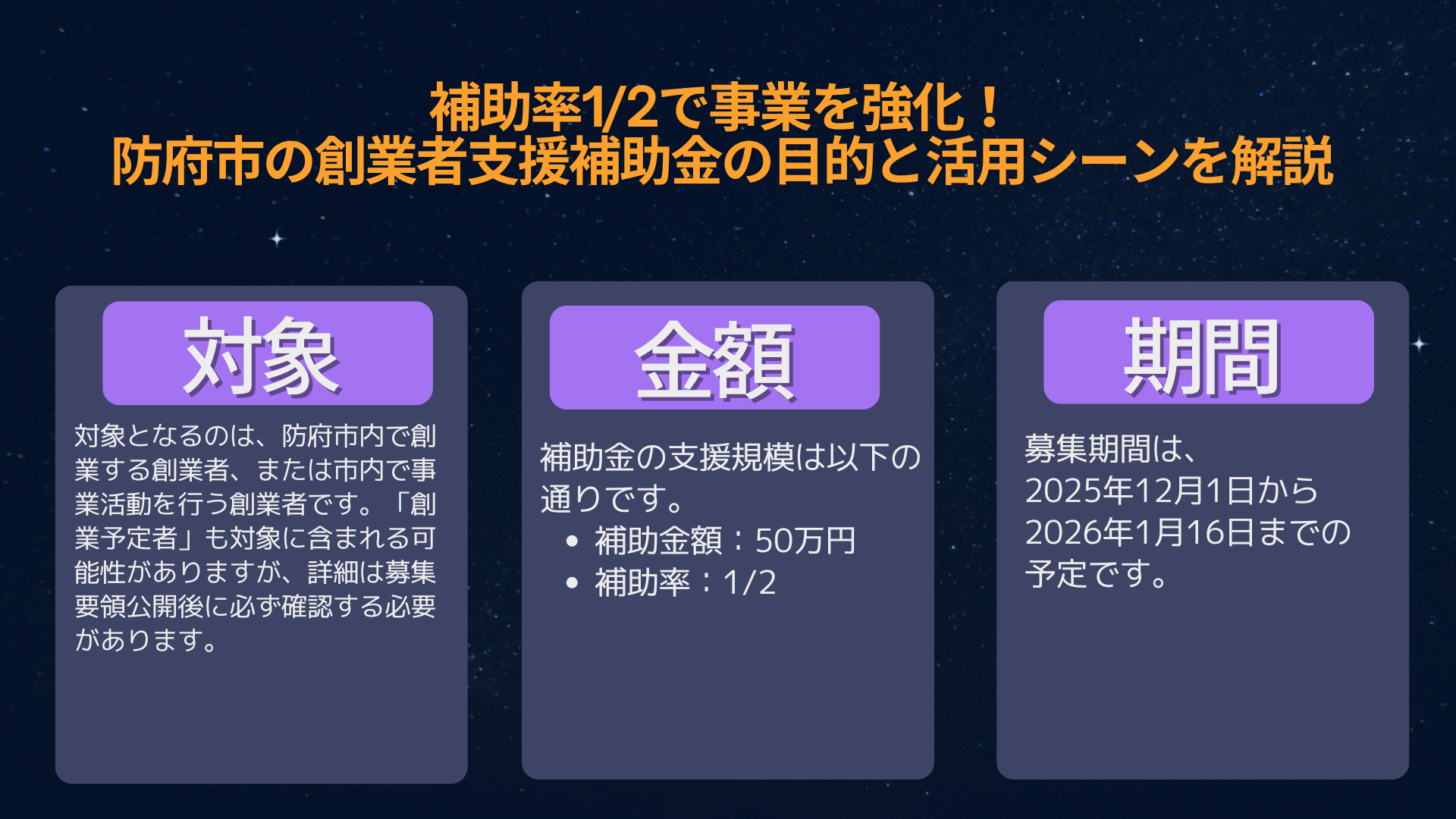 対象となるのは、防府市内で創業する創業者、または市内で事業活動を行う創業者です。「創業予定者」も対象に含まれる可能性がありますが、詳細は募集要領公開後に必ず確認する必要があります。