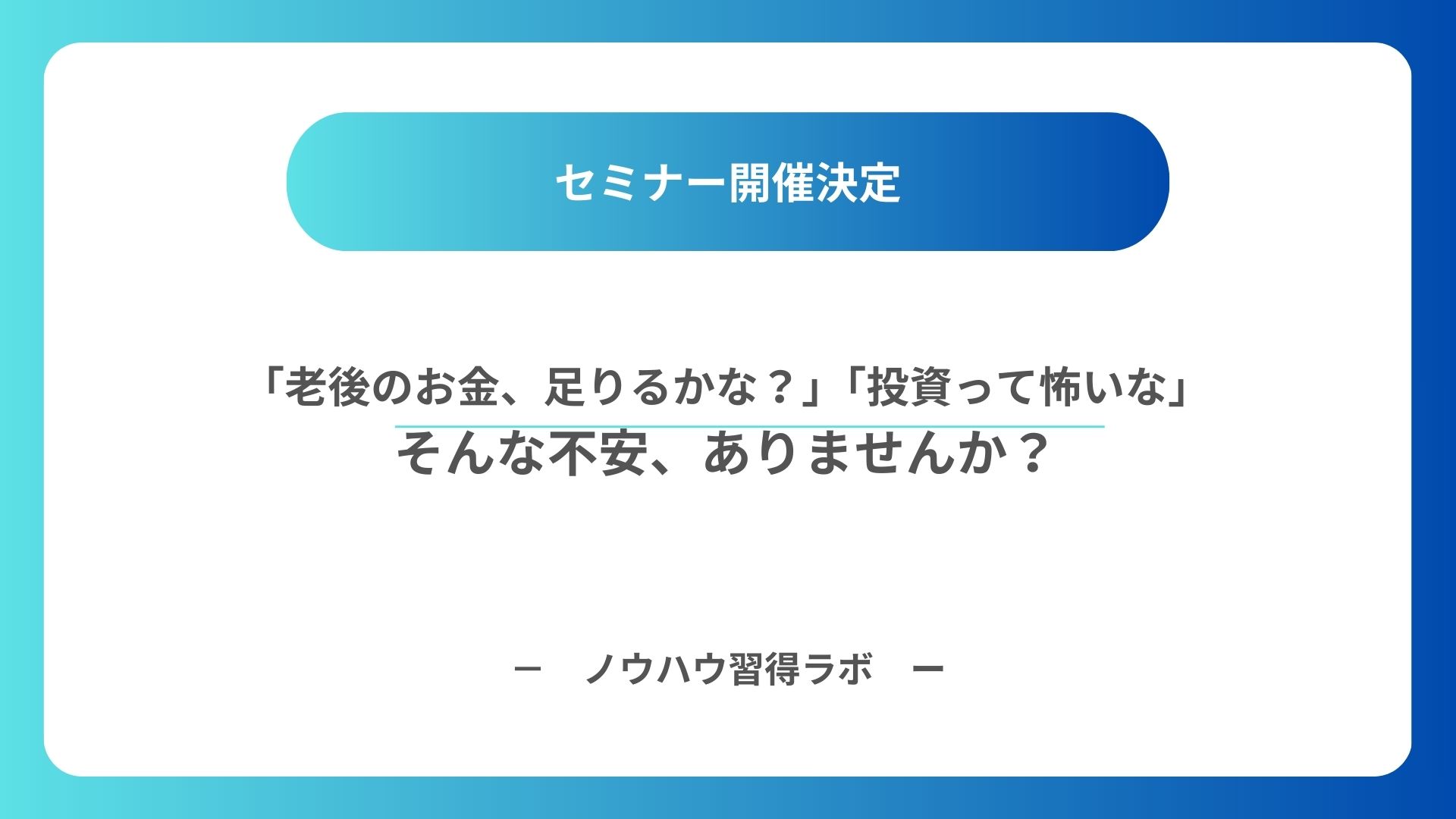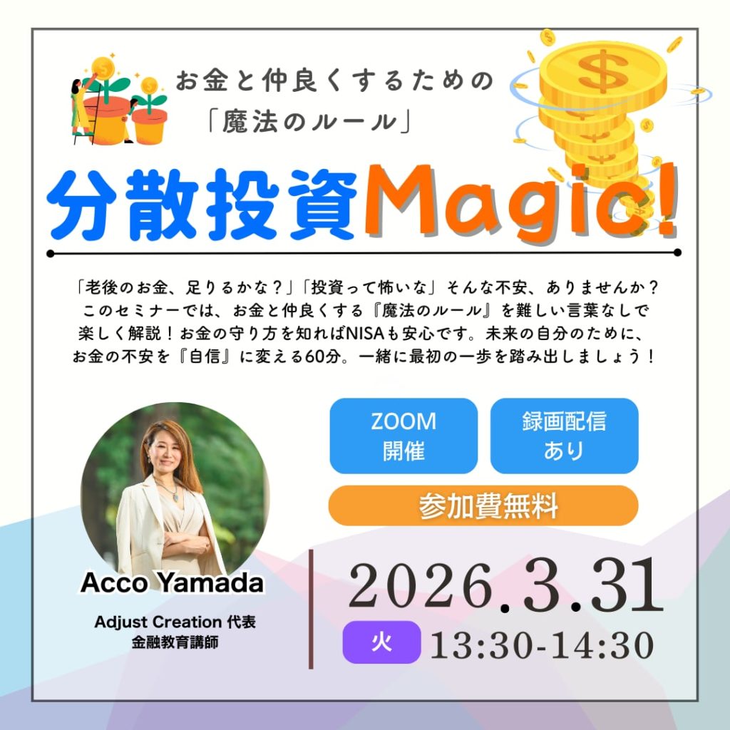 「老後のお金、足りるかな?」「投資って怖いな」そんな不安、ありませんか?このセミナーでは、お金と仲良くするための「魔法のルール」をお教えします。