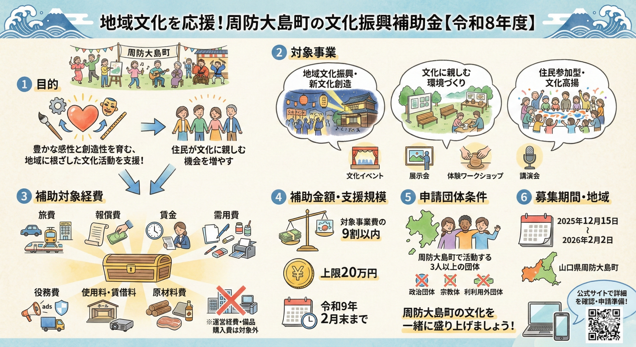 周防大島町では、令和8年度に向けて、地域の教養・文化に対する意識を高め、豊かな感性と創造性を育むことを目的とした「文化振興補助金事業」を実施します。本記事では、補助金の目的や対象事業、支援内容、申請できる団体の条件などを、初めての方にも分かりやすく解説します。