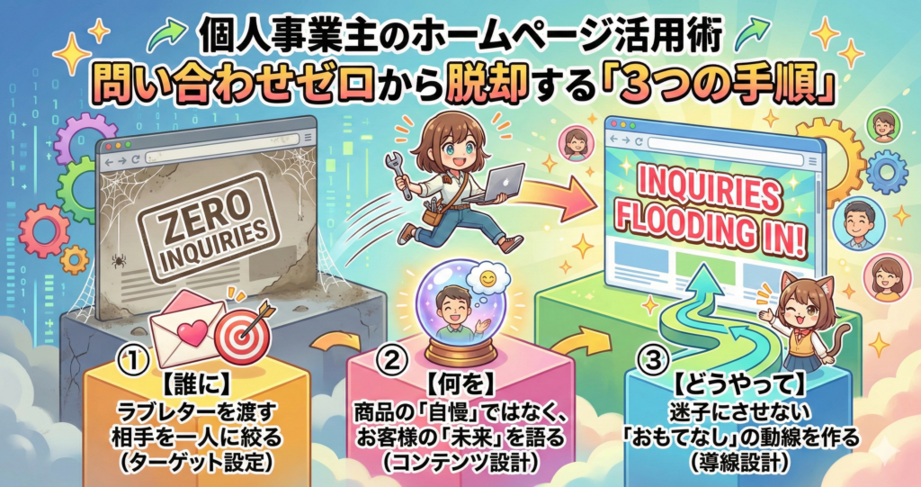 今日は、そんな「問い合わせゼロ」の状態から脱却し、あなたのホームページをしっかりと働く「稼ぐ営業マン」に育て上げるための、具体的な**「3つの手順」**をお話しします。
