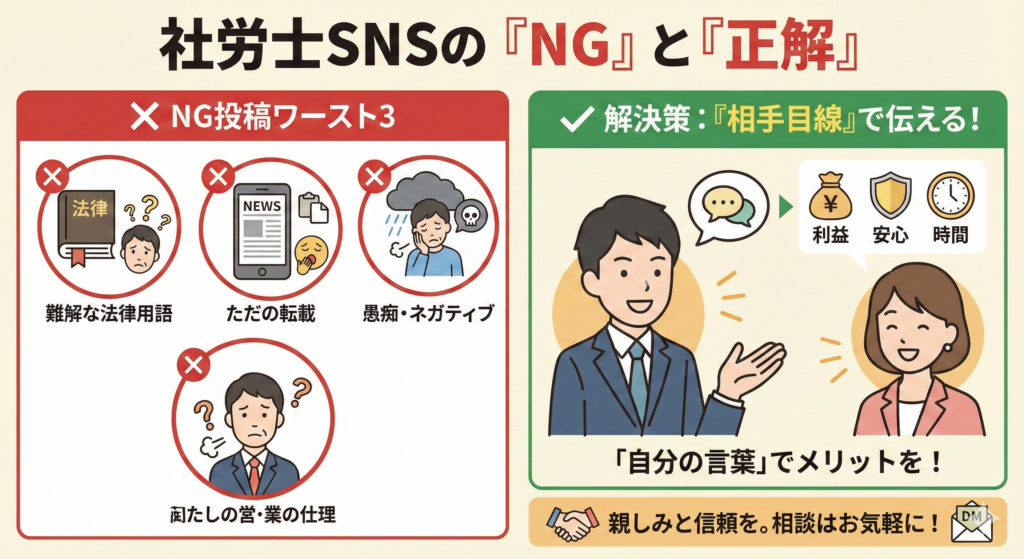 今日は、業務拡大を目指す社労士が避けるべき「NG投稿」を3つ紹介します。