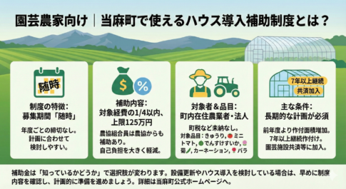 補助金・助成金情報北海道当麻町では、施設園芸作物の生産面積減少への対策として、園芸用ハウスおよび関連資材の導入に対する補助制度を実施しています。設備投資の負担が大きい施設園芸において、こうした補助金は経営を安定させる重要な支援策です。本制...