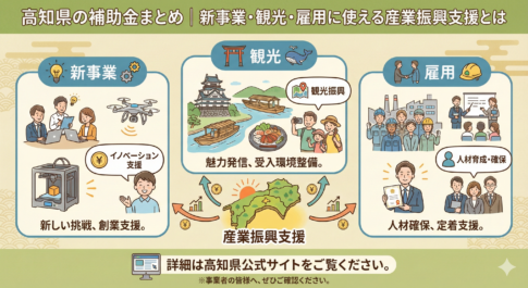 補助金・助成金情報高知県では、地域経済を元気にするために「高知県産業振興計画」を進めています。その中で重要な役割を果たしているのが、今回紹介する補助金制度です。この補助金は、商品やサービスの企画段階から、開発、加工、販路拡大、そして観光産...
