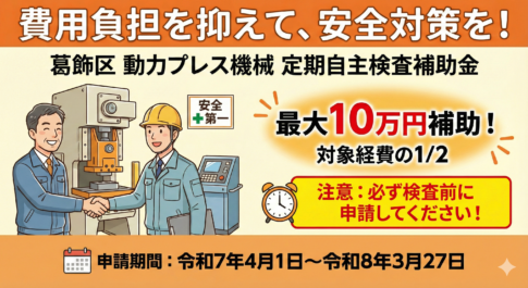補助金・助成金情報【葛飾区】動力プレス機械の検査費用を削減!最大10万円の補助金活用ガイド 葛飾区内で製造業を営む皆様、工場の設備管理やコスト削減にお悩みではありませんか。特に「動力プレス機械」を使用している事業所では、労働安全衛生法に基...