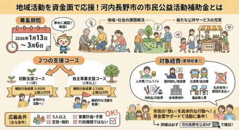 補助金・助成金情報河内長野市では、地域や社会の課題解決、新たな公共サービスの充実を目的とした市民公益活動に対し、補助金を交付する制度を設けています。本制度は、市民公益活動の活性化と、市民・団体・行政が協力してまちづくりを進めていくことを目...